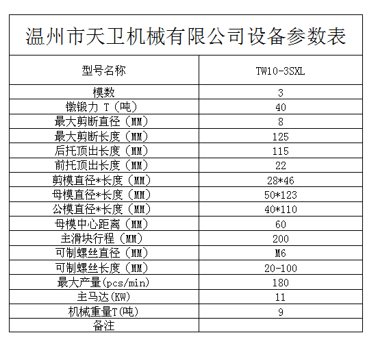 您當(dāng)前的位置:首頁 / 產(chǎn)品中心 / 三模三沖冷鐓機(jī) / └ TW10B(M6)全自動(dòng)多工位冷鐓機(jī) / TW10B-3SXL全自動(dòng)多工位冷鐓機(jī)